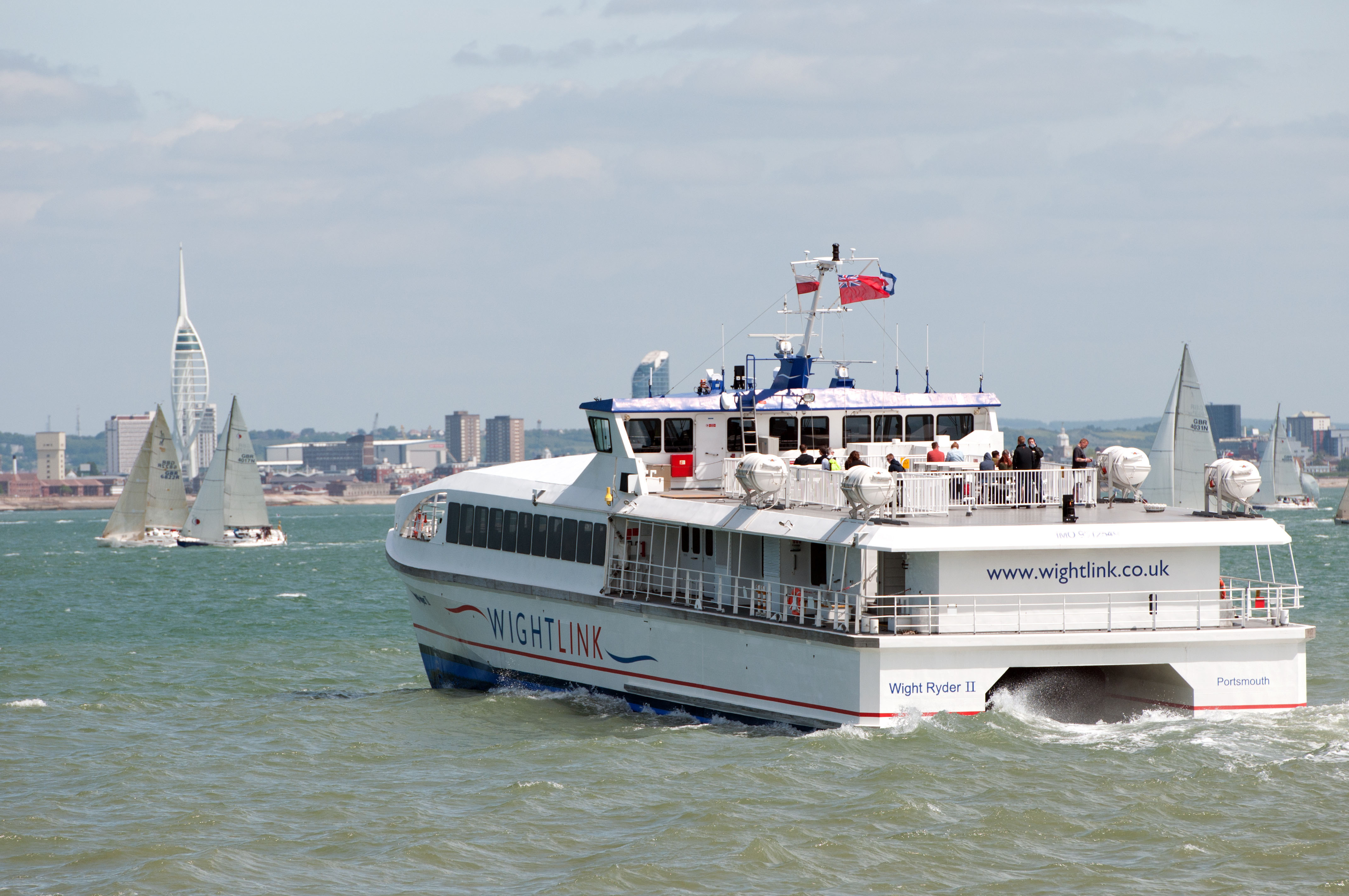 Wight Ryder I, a catamaran operated by Wightlink, crosses the Solent from Portsmouth, England, to Ryde on the Isle of Wight 07 Jun 2017